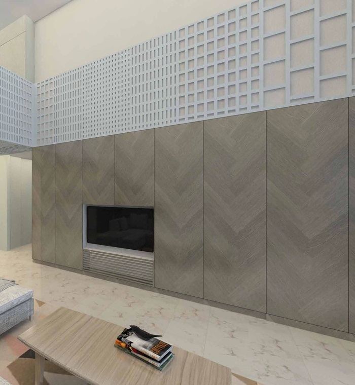 Highlight: Mounted onto a substrate before perforating to shapes we have freed laminates from the constraints of being merely a covering – now with the ability to create bespoke screens and ceiling; we have made the banister the center of attraction for this fashionable loft apartment.