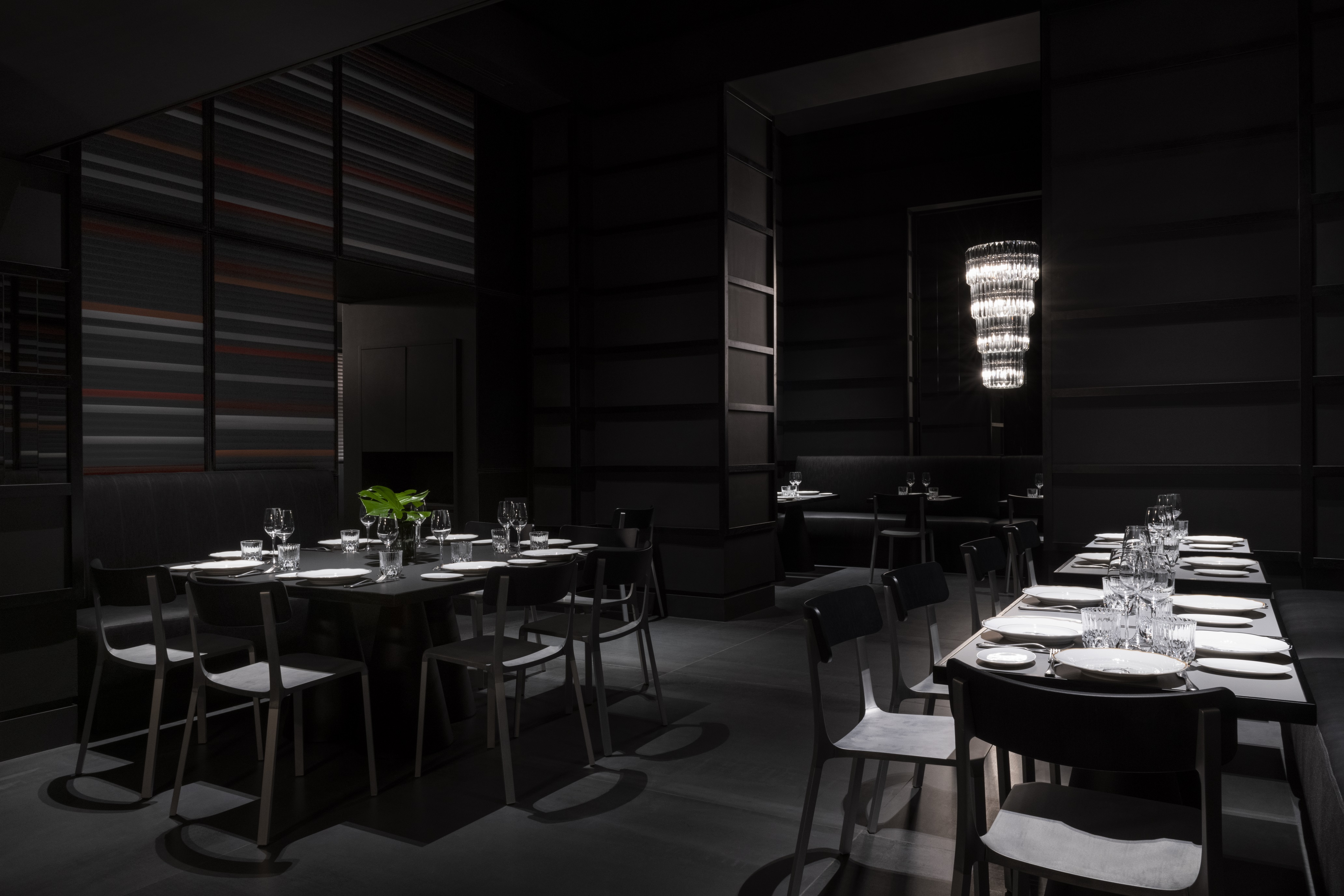 Boiserie FENIX NTM® Nero Ingo. Tables in FENIX NTM® Grigio Antrim.