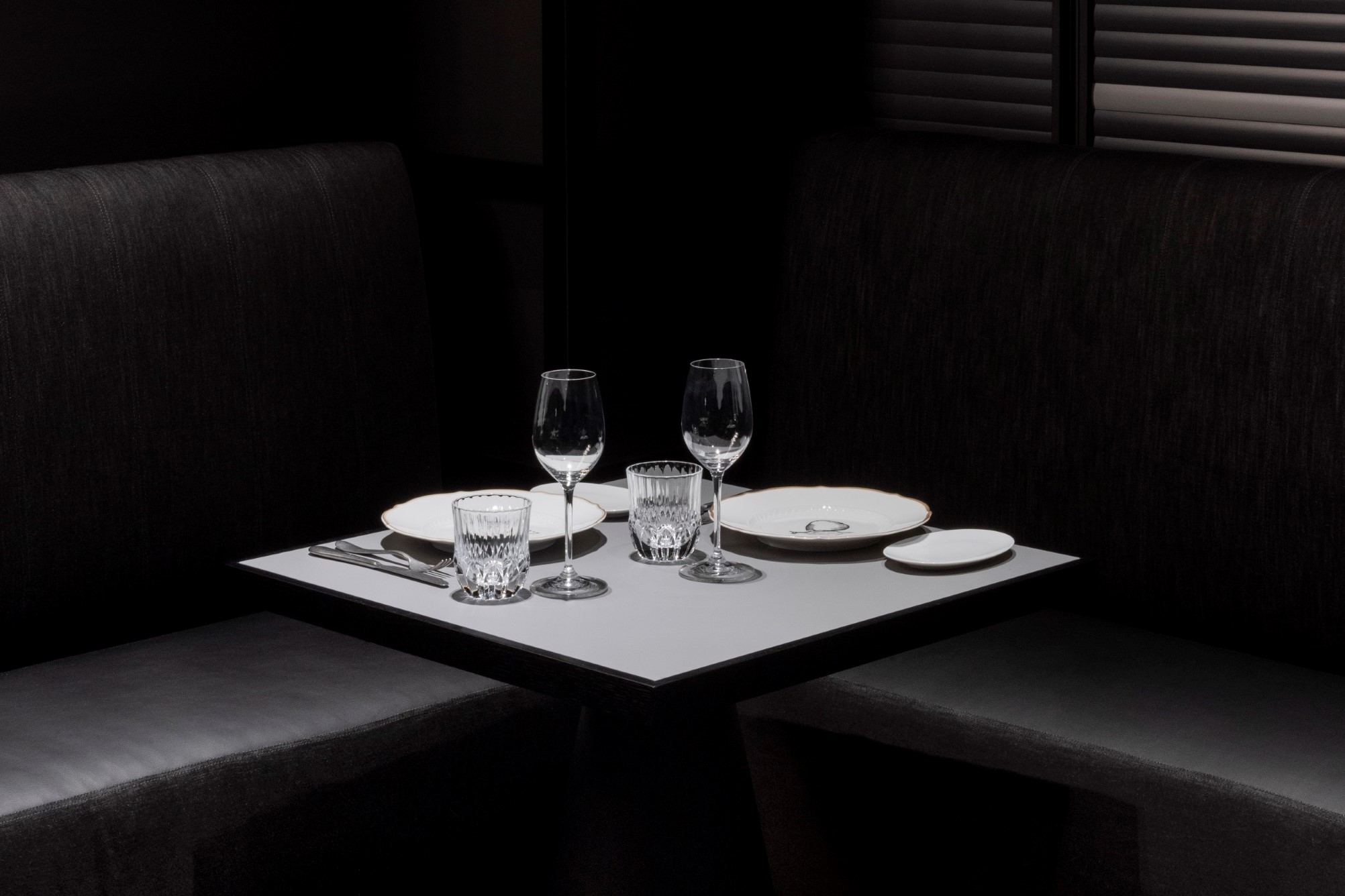 The tables made of FENIX are paired with bench seating upholstered with washed-effect black denim, whilst the chairs are made from specially unpainted aluminium, a conscious choice intended to lend the whole environment a non-conformist and one-of-a-kind vibe.