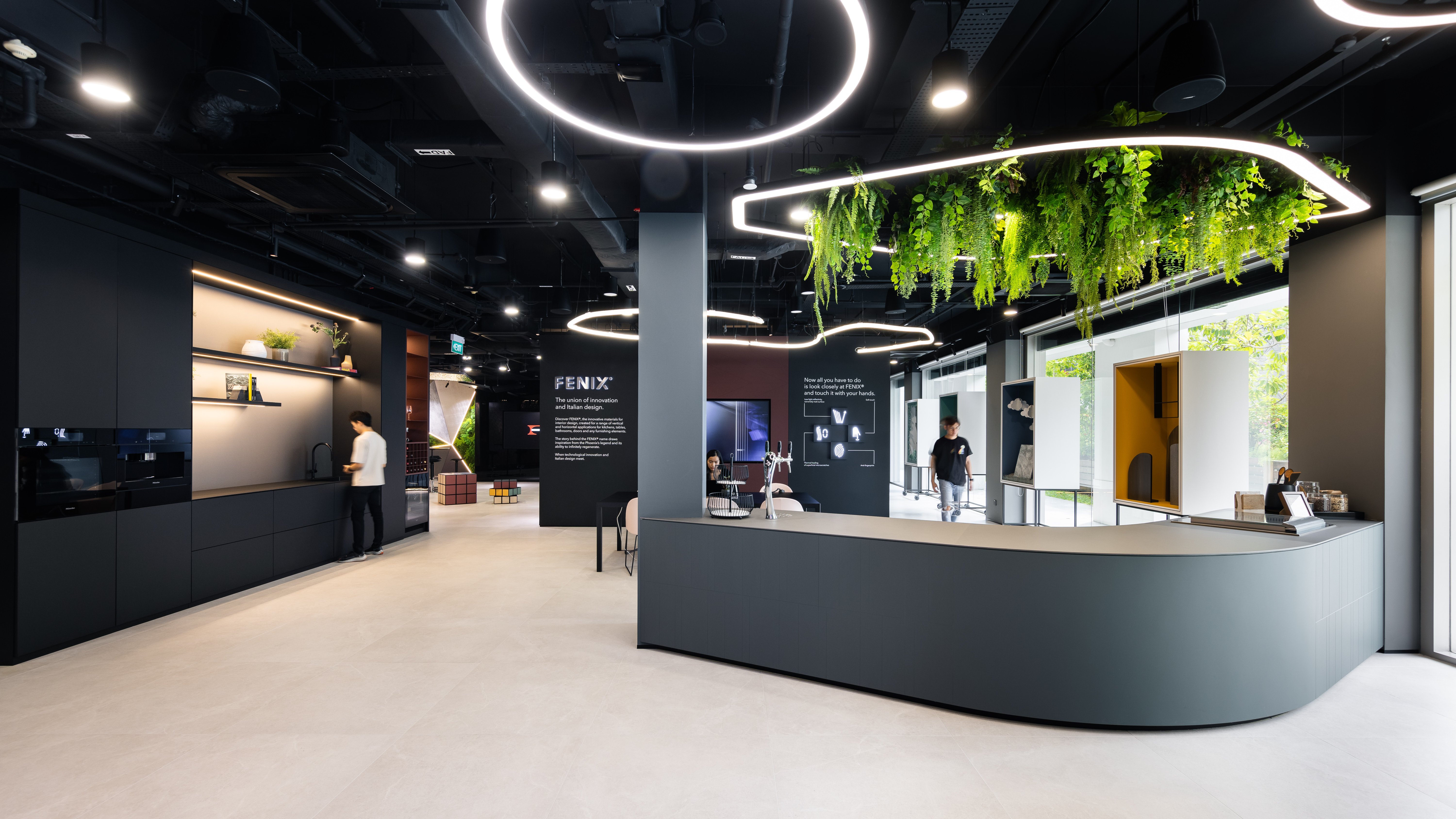The feather in the cap of this showroom is definitely Formica’s own zone, which doubles as the company’s material library. Here, visitors and customers can experience Formica® Laminates in real scale and real size on 360˚ rotary pull out racks. The material library is equipped with cool, warm and day light to help viewers better visualize the laminate designs in their preferred room lighting as if they were installed in their very own homes!