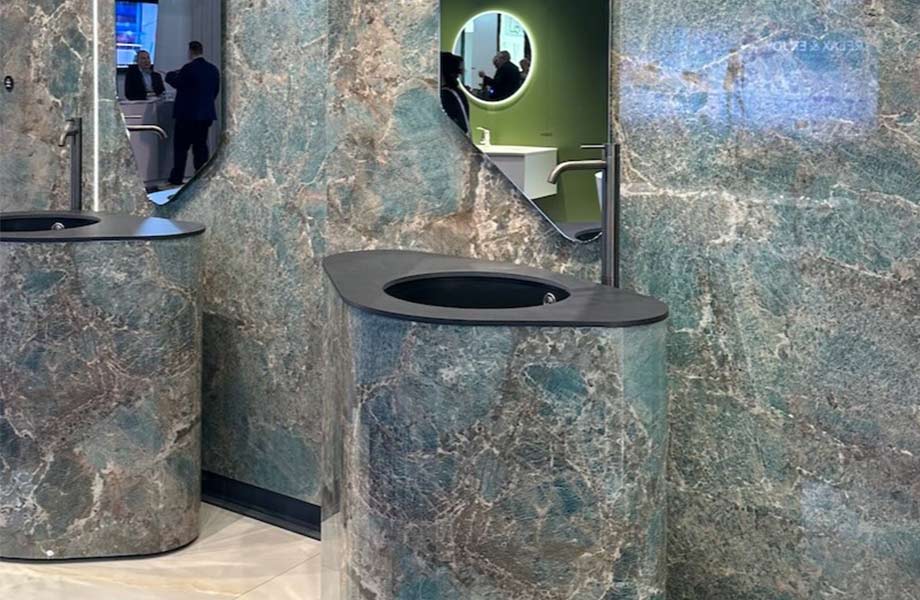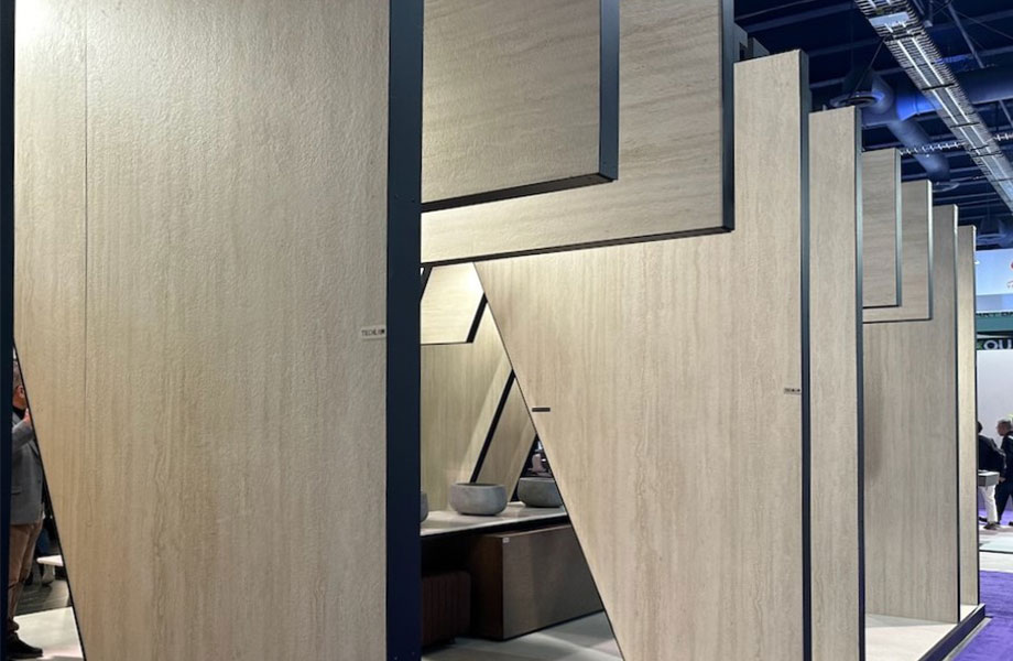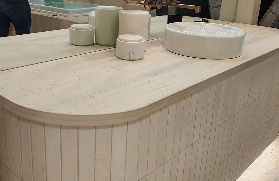 Cette année, nous avons côtoyé les 117 000 participants du salon KBIS + IBS qui comptait plus de 2 400 exposants présentant une foule de tendances remarquables. La couleur avait une place de choix au salon, notamment avec les bleus et verts vintage, auxquels s’ajoutait la couleur de l’année Pantone, Peach Fuzz, ainsi que des tons plus sombres et dramatiques. En outre, les modèles de pierres spectaculaires et les marbres classiques avaient la cote. Souvent, l’accent était mis sur la richesse des veines du marbre et sur différents éléments biophiliques.