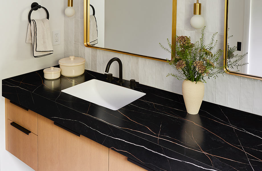 Les pierres décoratives étaient omniprésentes et figuraient sur les murs, les îlots de cuisine et les vanités de salles de bain, toujours remarquables par leurs veinures spectaculaires. En effet, les stries chaleureuses continuent d’être populaires, mais elles sont de plus en plus intenses et soulignées dans des tons terracotta, par exemple. Notre stratifié 180fx® Sahara Noir est un excellent exemple de ce look volontaire et dramatique.