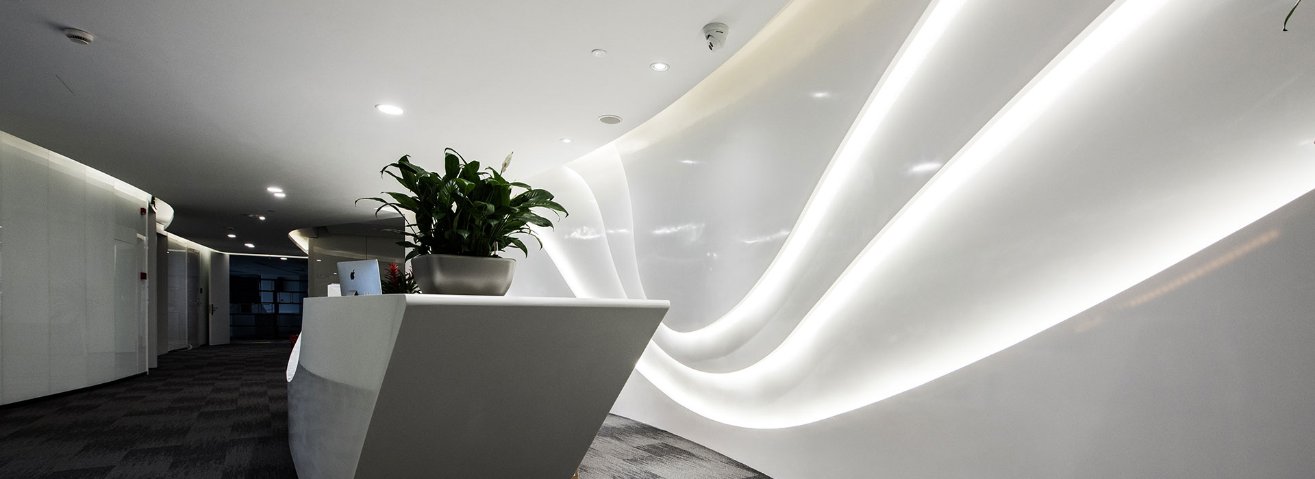 富美家®色麗石®共52个花色,分为复合亚克力和纯亚克力;复合亚克力适用于台面、墙体等平面应用;纯亚克力更可以广泛应用在曲面、异型加工等工艺造型