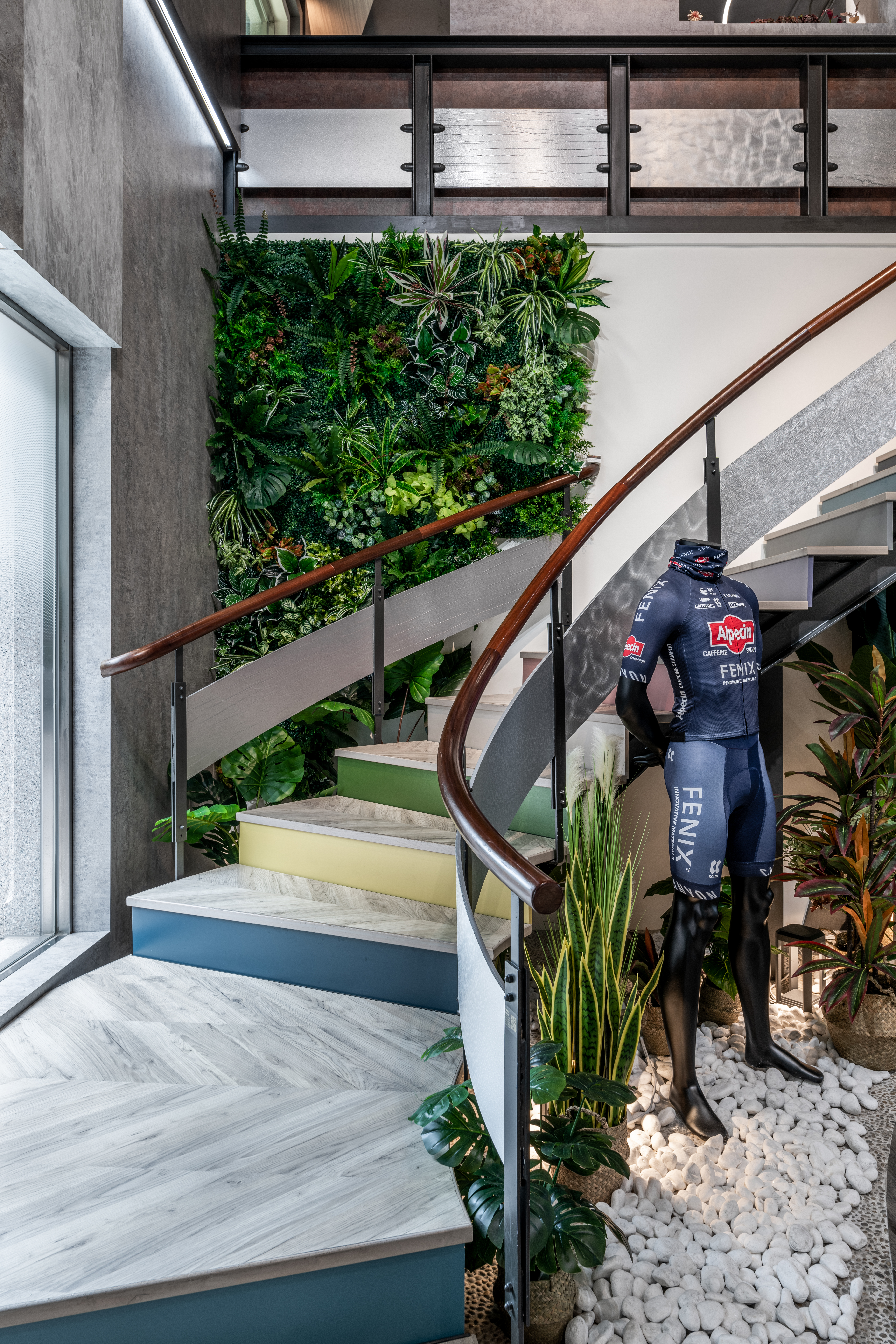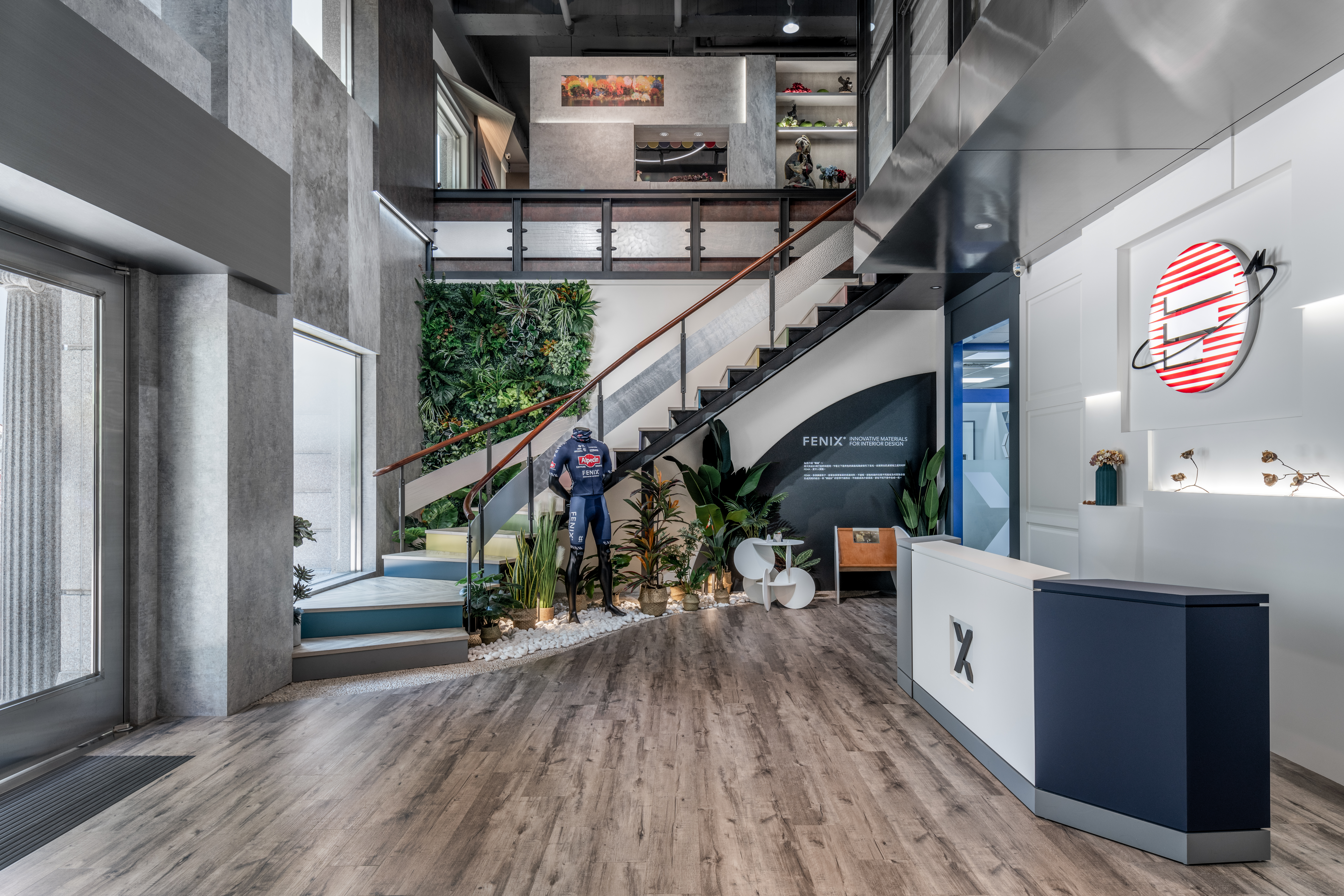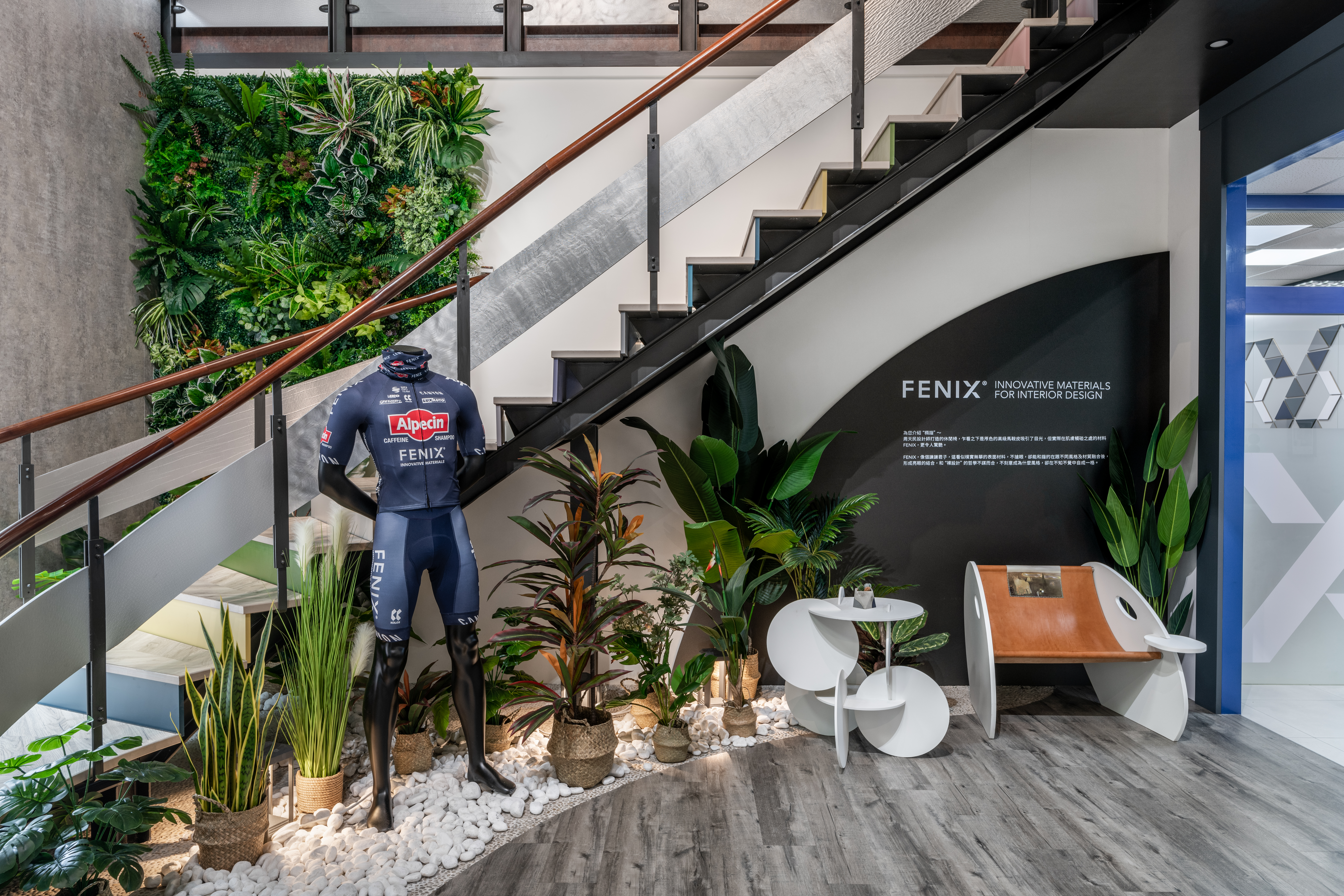 樓梯下方的畸零地雖占地不大,但卻為連結一樓與二樓的重要平衡與轉換點。於此處規劃綠能空間,以綠色植栽、FENIX®單車隊的車衣,以及周天民設計師打造的FENIX®「橢諧」單椅,傳達FENIX®永續環保的決心與努力。 而弧形樓梯則以明亮選色搭配美耐板同色收邊條,輕盈的選色彷彿一封邀請函,邀請每位貴賓前往二樓探索更多富美家的美好生活。