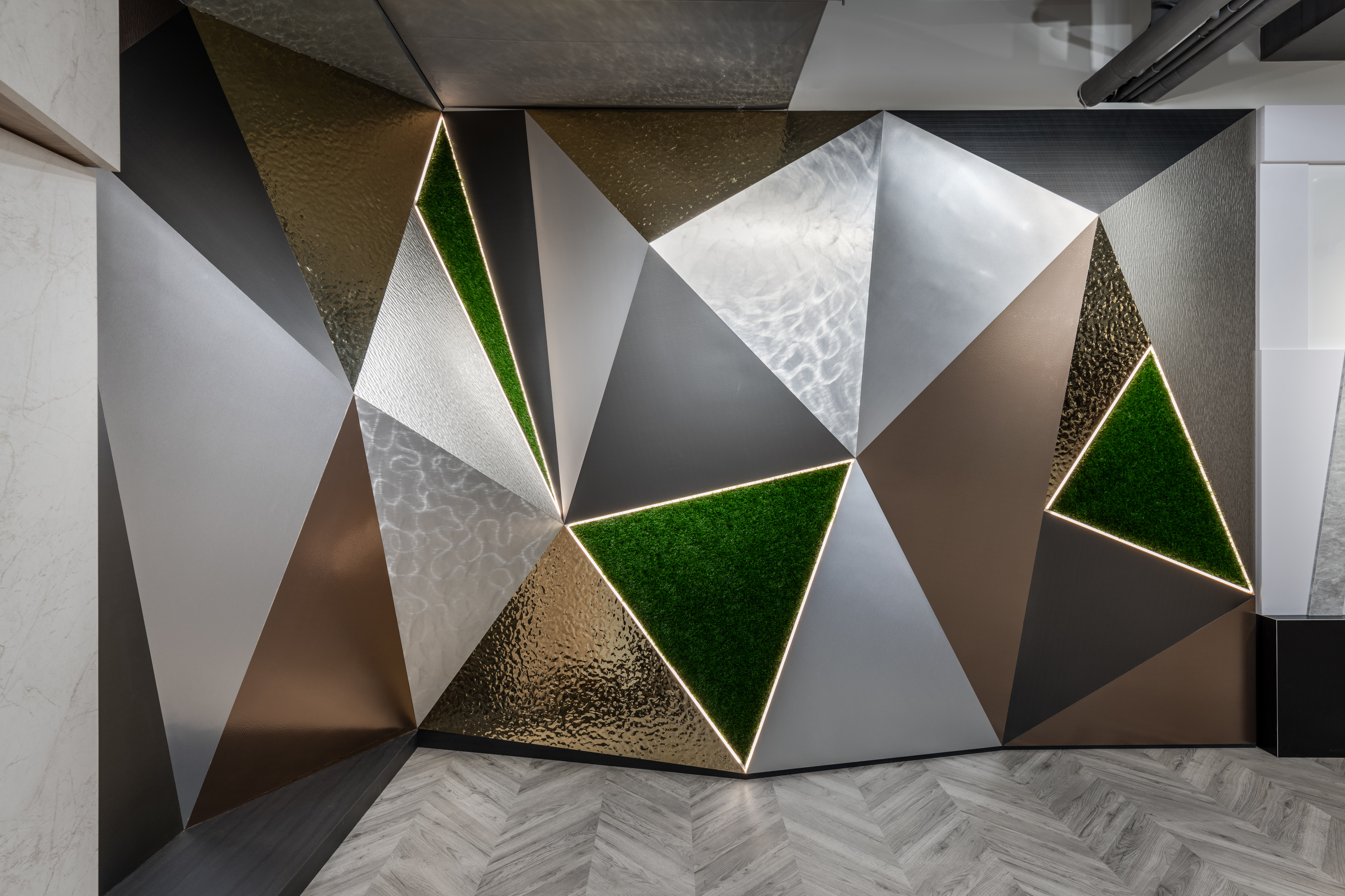 如實保留了金屬之美,卻比真實金屬更易運用,質輕耐用且更顯金屬效果。針對不同的金屬原色、奢華金色、復古銅色,搭配獨特的表面處理和曲線,為表面飾材提供更多結合科技感及藝術感的應用選擇。金麗®金屬SRM系列更提升了金屬質感,以超霧面的金屬光澤效果,回應對空間柔和感、色彩豐富性和表面耐用度的追求。